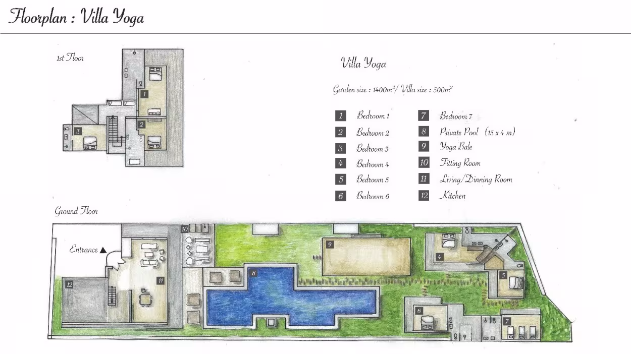 With no less than 7 bedrooms spread out across the expansive property of villa Yoga and a large open-plan yoga studio that overlooks the sparkling 25 meter swimming pool. This villa is ideal for holding special events and it is especially perfect for yoga gatherings and retreats. Villa Yoga has an abundance of communal hubs as well as cosy little hang out spots to enjoy some quiet time in the beautiful tropical garden. There are comfortable sofas for curling up with a good book or watching a movie on the big flat-screen TV with DVD-player. The huge square teak dining tables, one located inside and one outside on the breezy veranda, make great places for communal gathering spots while the breakfast-bar of the fully equipped state-of-the-art kitchen, makes a nice place to enjoy a mug of hot tea in the early morning before the yoga practice starts.