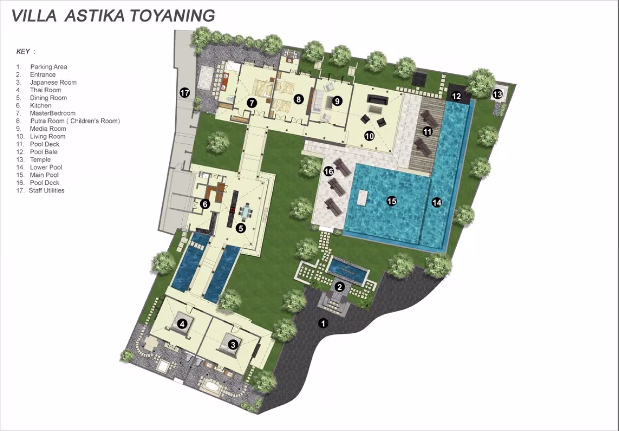 La Villa Astika Toyaning ofrece un gran espacio privado de aproximadamente 1600 m2, 4 habitaciones con baños privados (tres habitaciones dobles, una habitación con dos camas individuales), un pabellón comedor independiente con capacidad para 12 personas para cenar, una sala de estar abierta y una sala de TV multimedia con aire acondicionado. Hay tumbonas para 8 personas alrededor de las piscinas, así como un pabellón de relajación en la piscina situado al final de la piscina de entrenamiento. La amplia sala de estar de espacio abierto tiene vistas a las piscinas y al jardín. Villa Astika Toyaning significa "agua hermosa". Astika significa belleza y minimalismo y Toyaning, agua limpia y fresca.