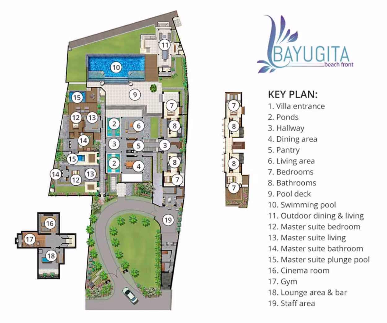 Un superbe passage traversant un bassin à poissons mène à la salle à manger et à l’immense hall d’entrée. Le rez-de-chaussée de la villa comprend deux chambres, la cuisine et un salon s’ouvrant largement sur le jardin. Le jardin abrite une vaste piscine avec jacuzzi, un salon extérieur, une salle à manger couverte avec un bar et une passerelle menant directement à la plage. Des escaliers depuis le hall d’entrée descendent vers la salle de sport, le cinéma et la salle de jeux, tandis que l’étage supérieur abrite deux autres chambres. Les deux chambres principales, chacune dotée d’un bassin privé, sont accessibles depuis le hall d’entrée ou par une entrée séparée depuis l’entrée principale.