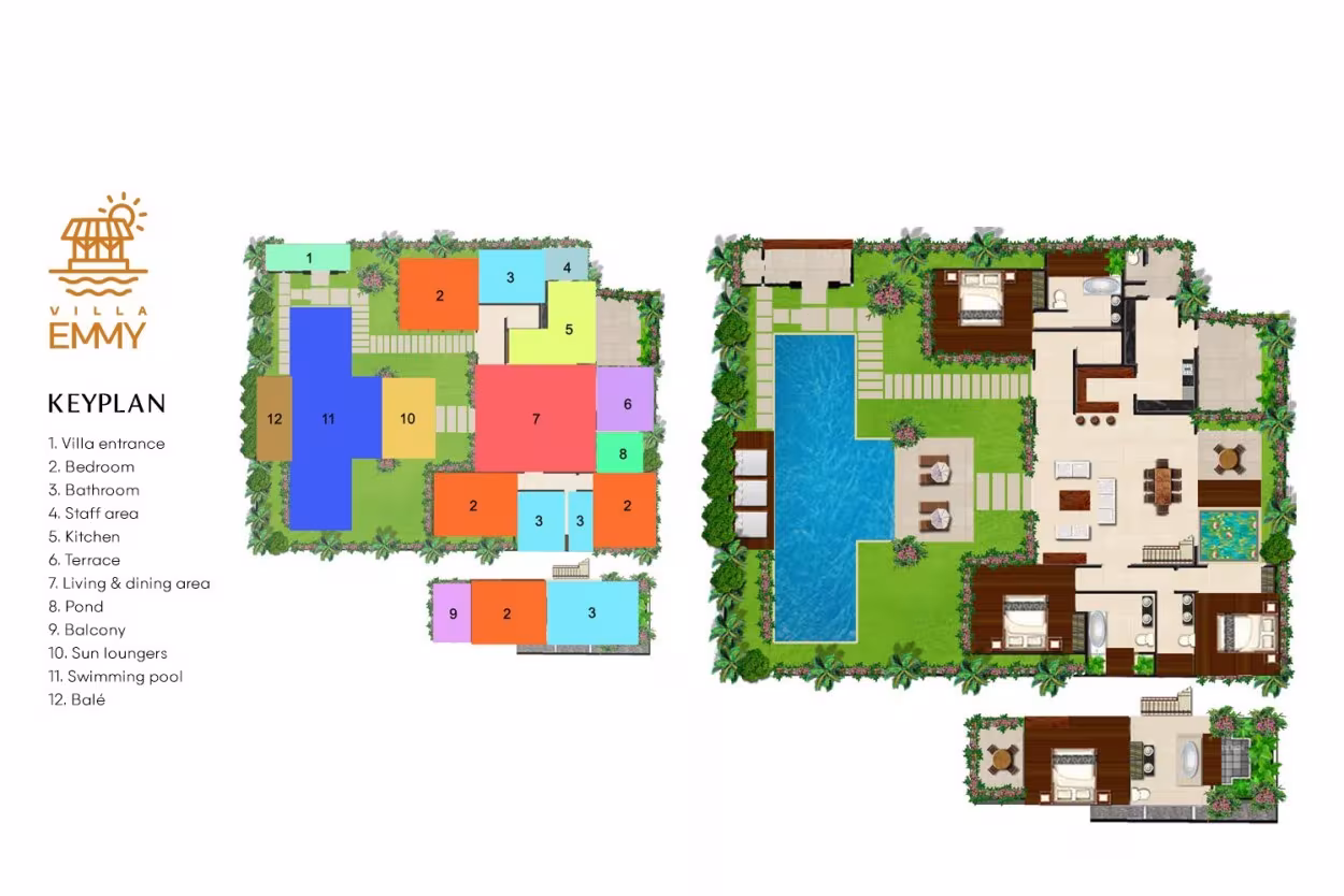 В общей сложности здания виллы и ее сад занимают территорию в 610 кв. м. Поскольку вилла расположена мене, чем в 300 метрах от пляжа и всего в трех минутах пешей прогулки от таких знаменитых ресторанов, как Ku De Ta, La Luciola и Hu’u, вилла Emmy – это идеальный выбор как для взрослых групп, так и для семей с детьми всех возрастов, желающих отдохнуть на Бали. В дизайне виллы использована игра пространства и света и контрастирующей теплой зелени тропических садов. Всем постояльцам виллы на время их отдыха предоставляется возможность бесплатного членства в находящемся неподалеку частном загородном клубе Canggu Club.